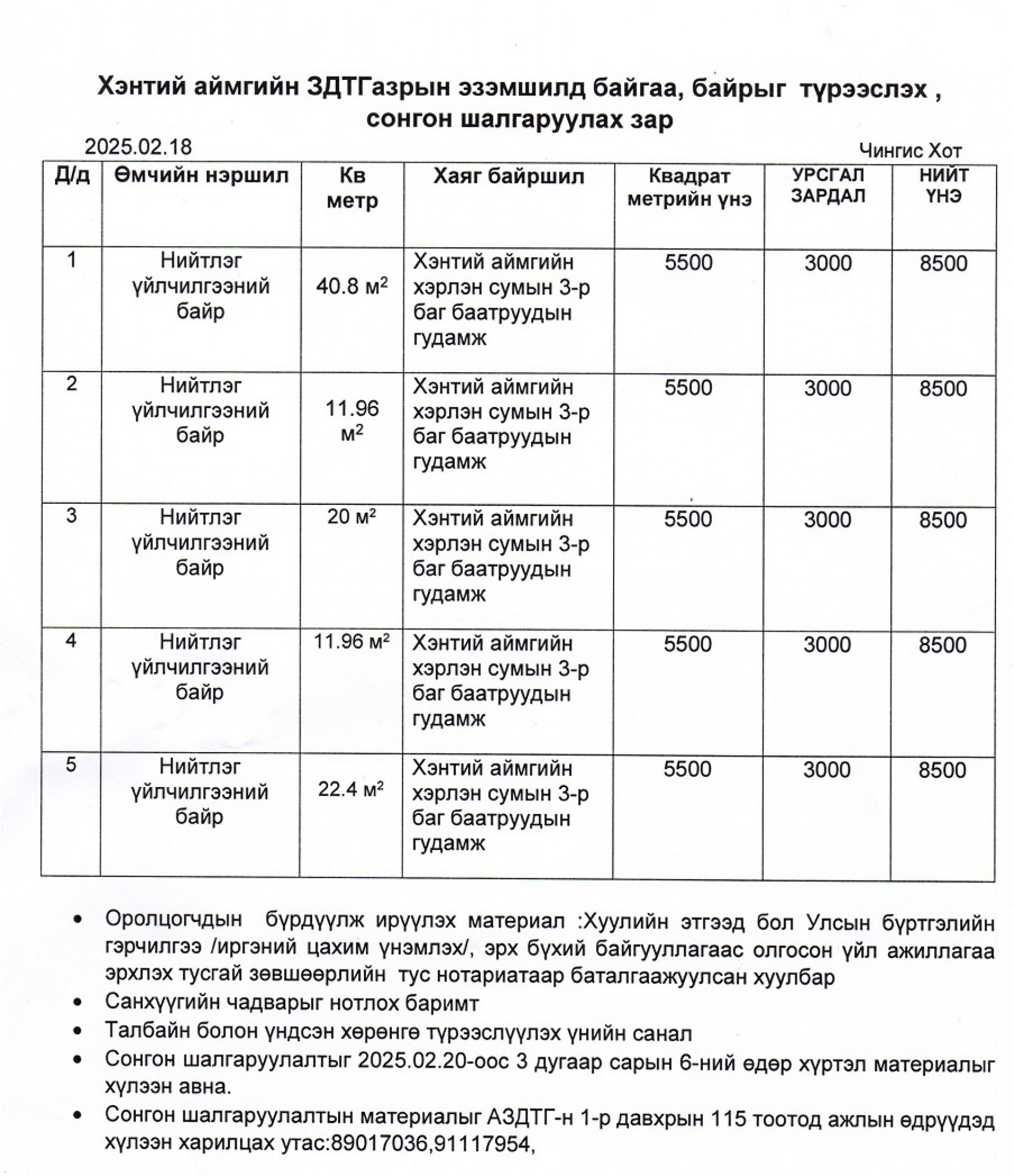 ХЭНТИЙ АЙМГИЙН ЗАСАГ ДАРГЫН ТАМГЫН ГАЗРЫН ЭЗЭМШИЛД БАЙГАА, БАЙРЫГ ТҮРЭЭСЛЭХ СОНГОН ШАЛГАРУУЛАЛТ ЗАРЛАЛАА.