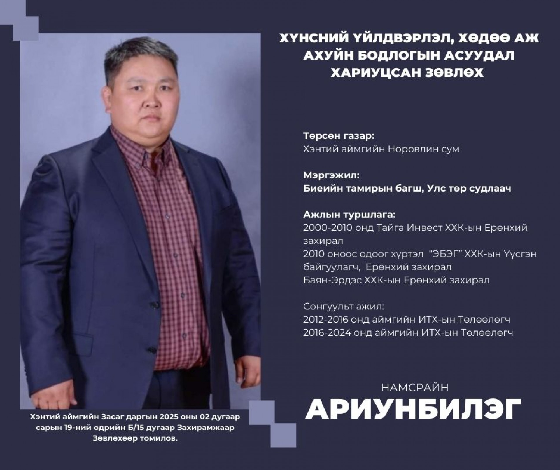 АЙМГИЙН ЗАСАГ ДАРГЫН "ХҮНСНИЙ ҮЙЛДВЭРЛЭЛ, ХӨДӨӨ АЖ АХУЙН БОДЛОГЫН АСУУДАЛ ХАРИУЦСАН ЗӨВЛӨХ"-ӨӨР НАМСРАЙН АРИУНБИЛЭГИЙГ ТОМИЛЛОО