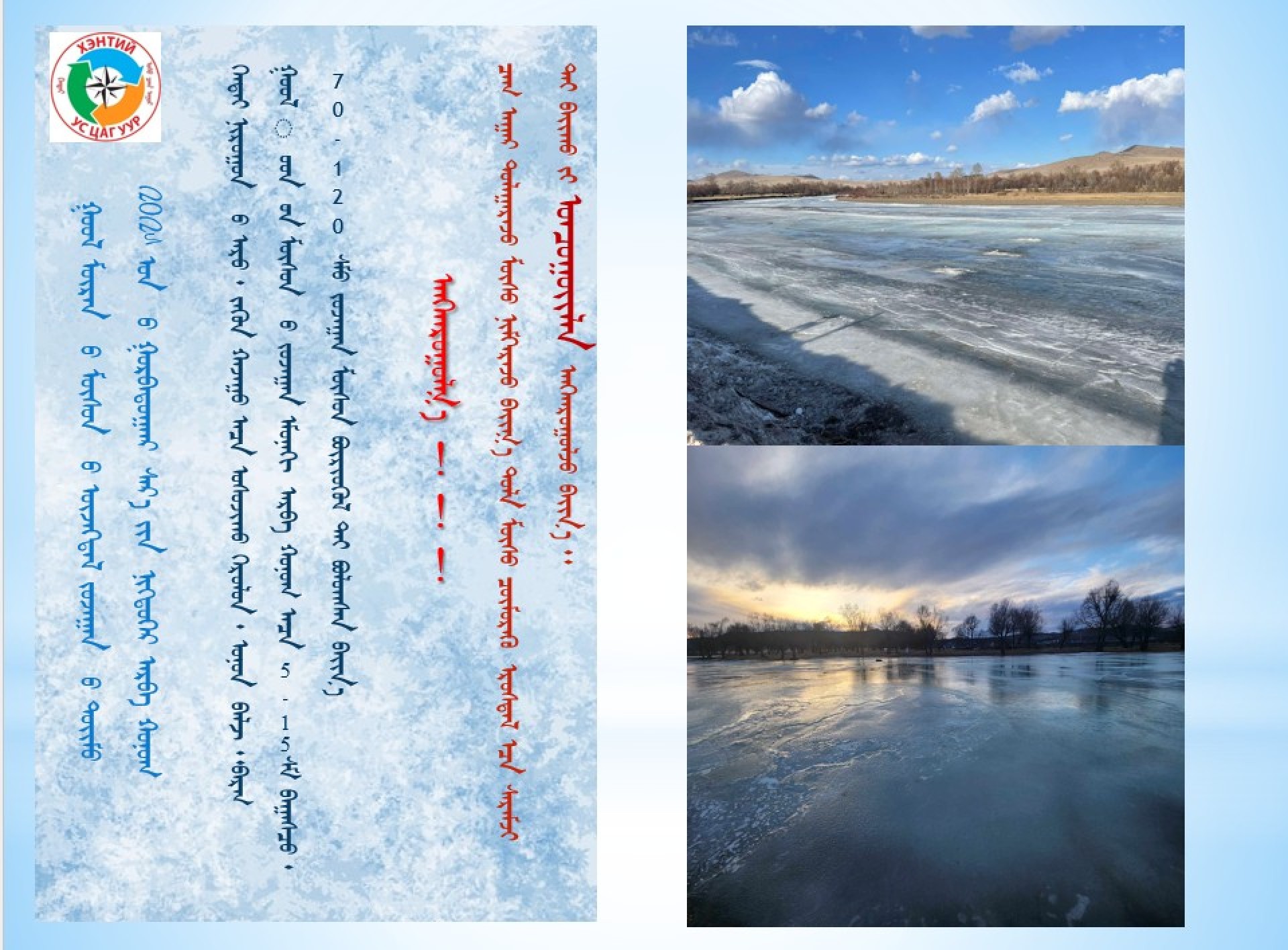 ⚠️ Цаг агаар дулаарч мөс нимгэрч байгаа тул мөс цөмрөх эрсдэлээс сэрэмжтэй байхыг ОНЦГОЙЛОН анхааруулж байна.
