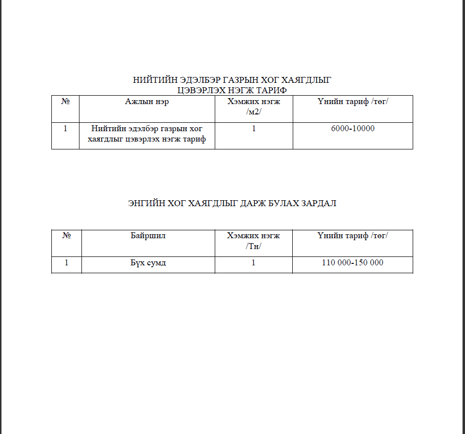 Монгол Улсын Хог хаягдлын тухай хуулийн 9 дүгээр зүйлийн 9.1.4-т заасны дагуу нийтийн эдэлбэр газрын хог хаягдлыг цэвэрлэх, энгийн хог хаягдлыг булшлах зардлын нэгж тарифыг аймгийн Иргэдийн Төлөөлөгчдийн Хурлаар батлуулах тул Захиргааны ерөнхий хуулийн 62 дугаар зүйлийн 62.1-т заасны дагуу иргэд, олон нийтийн саналыг авч байна.